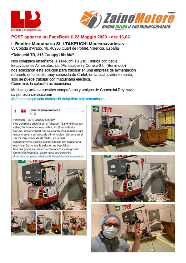 Nos complace enseñaros la Takeuchi TS 216, Hidrida con cable,  Excavaciones Almusafes, slu (Almusages) y Coruse S.L. (Benimodo)  nos solicitaron esta solución para trabajar en una empresa de alimentación  referente en el sector muy conocida de Carlet, en la cual, evidentemente,  solo se puede trabajar con maquinaria electrica.